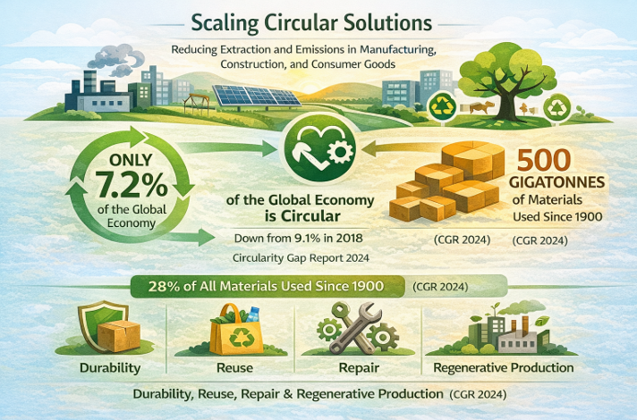 Circular systems are delivering similarly tangible signals while also exposing the size of the challenge. The Circularity Gap Report 2024 shows the global economy is now only 7.2% circular, down from 9.1% in 2018. In just five years, humanity has consumed over 500 gigatonnes of materials, 28% of all materials used since 1900. Solutions focused on durability, reuse, repair, and regenerative production remain among the fastest levers to reduce extraction pressure and embedded emissions across manufacturing, construction, and consumer goods. (CGR 2024)
