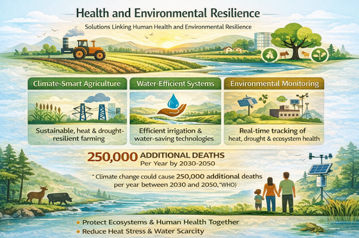 At the intersection of people and planet, solutions linking human health and environmental resilience are gaining urgency. Climate-smart agriculture, water-efficient systems, and real time environmental monitoring are strengthening resilience in regions already facing heat stress, water scarcity, and food insecurity. The World Health Organization estimates climate change could cause 250,000 additional deaths per year between 2030 and 2050, underscoring why climate action must protect ecosystems and human health together not as separate agendas. (WHO)