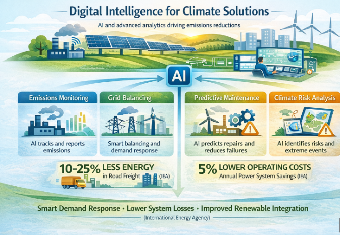 Digital intelligence is one such accelerator. AI and advanced analytics are now embedded in emissions monitoring, grid balancing, predictive maintenance, and climate-risk analysis. The International Energy Agency estimates that digitalisation can cut energy use by 10–25% in road freight, up to 10% in buildings, and reduce operating costs across power systems by around 5% annually. When deployed at scale, these gains translate into real emissions reductions through smarter demand response, lower system losses, and improved renewable integration, provided the energy footprint of digital infrastructure continues to decline. (IEA)